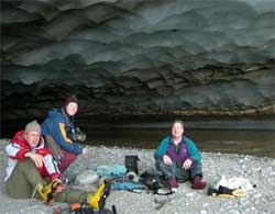 Hip waders. Is it not embarrassing to be a fully qualified egotistical ice caver, in Alaska, therefore more likely to be festooned in the latest models of the most whizgaget day-glow lime green plastic titanium ice caving gear, which we cannot afford but sounds good, and instead have to put on hip waders, with clunky old fashioned crampons, because we were going to wade on ice and rocks, upstream, through a creek coming out of a glacier, and call that ice caving? Pitiable. That is why I wanted to bag out. Real ice cavers wear climbing boots and do not touch water until it is frozen. We had one real climber with real climbing boots, outers, put over a drysuit, but the suit looked baggy so the rest of us retained our comparative ice caving image.