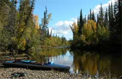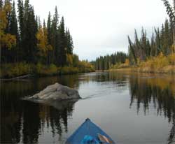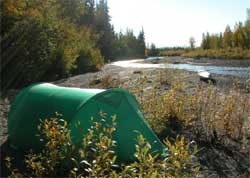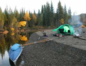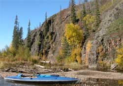 Somehow time slowed down in proportion to the wine I had yet to drink, delaying my schedule. Upon arriving at my First Night Secret Creek Camp, mid afternoon, I debated the issue for a nano duration, and camped immediately in sunshine and fall colors. Almost shot the top off another bottle of wine, with my .44, because it took awhile to find the corkscrew. The object of the wine thing was to reduce the weight of the kayak, because I had to add the weight of the mammoth bone piece. Even at higher water, and a small moose load, the creek has many shallow fans that require dragging the kayak over the rocks. Those do not show up in the photos, on account as the photographer had to help drag the kayak.