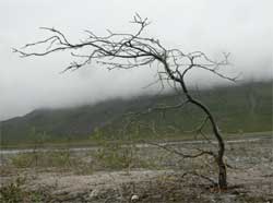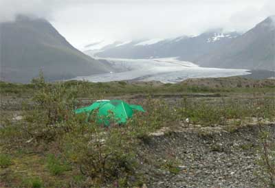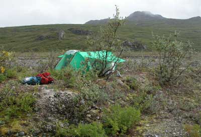 High camp is just below the slot the river cuts through the terminal moraine in a single channel of violent water. Back in the early days the broad glacier terminus spread the water out over a mile and a half wide flat of cobbles and pebbles, where now lichens, moss, and the heartiest of small plants and brush are challenging the rule of rock and cold mountain air. My tent spot is on an older patch of rocks, close to the river, that has survived the random slashes of heavy spring run-off. During that time willows grew more roots to better defend that spot's edges from each next random flow of water. It can be washed away at any time, but it is a few inches higher, drier and more secure than anything around it.