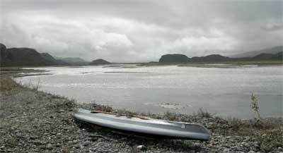 The return route, moving fast anywhere across the expanse of glacier silt-laden water, washing in varied vectors along and across a lacework of unseen, submerged braids, water commonly colliding with water, at, before or beyond abrupt depth changes between an inch and eight feet, leaves one rapidly deciding which nuance of surface water appearance to follow or desperately attempt to reach, all too often encountering, nose-on, broadside or somewhere in between, the aforementioned one inch depth, effecting a sudden stop and tipping action, and not knowing, while hastily jumping out of the kayak into the water in the middle of the river, if one will land in said one inch of water, or that eight foot deep part of glacier water slightly above freezing. The less of that upper section of river one lines up, the less one must get back down. At the place the water smacks into the rock, I would wisely walk back past on the bank, lining my kayak.