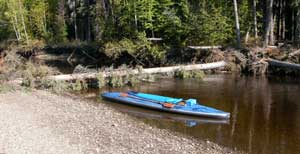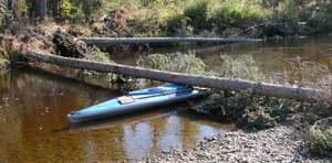 I was soon beyond any human competition, what with dragging my kayak over enough rocks to turn back those made timid by good sense. The large fallen spruce tree, completely crossing the creek, would stop anyone too impatient to saw through such a tree, not portage around it, and not able to squeeze under it like did I. If the water rose while I was upstream, I would have an easier return, until I reached that tree.